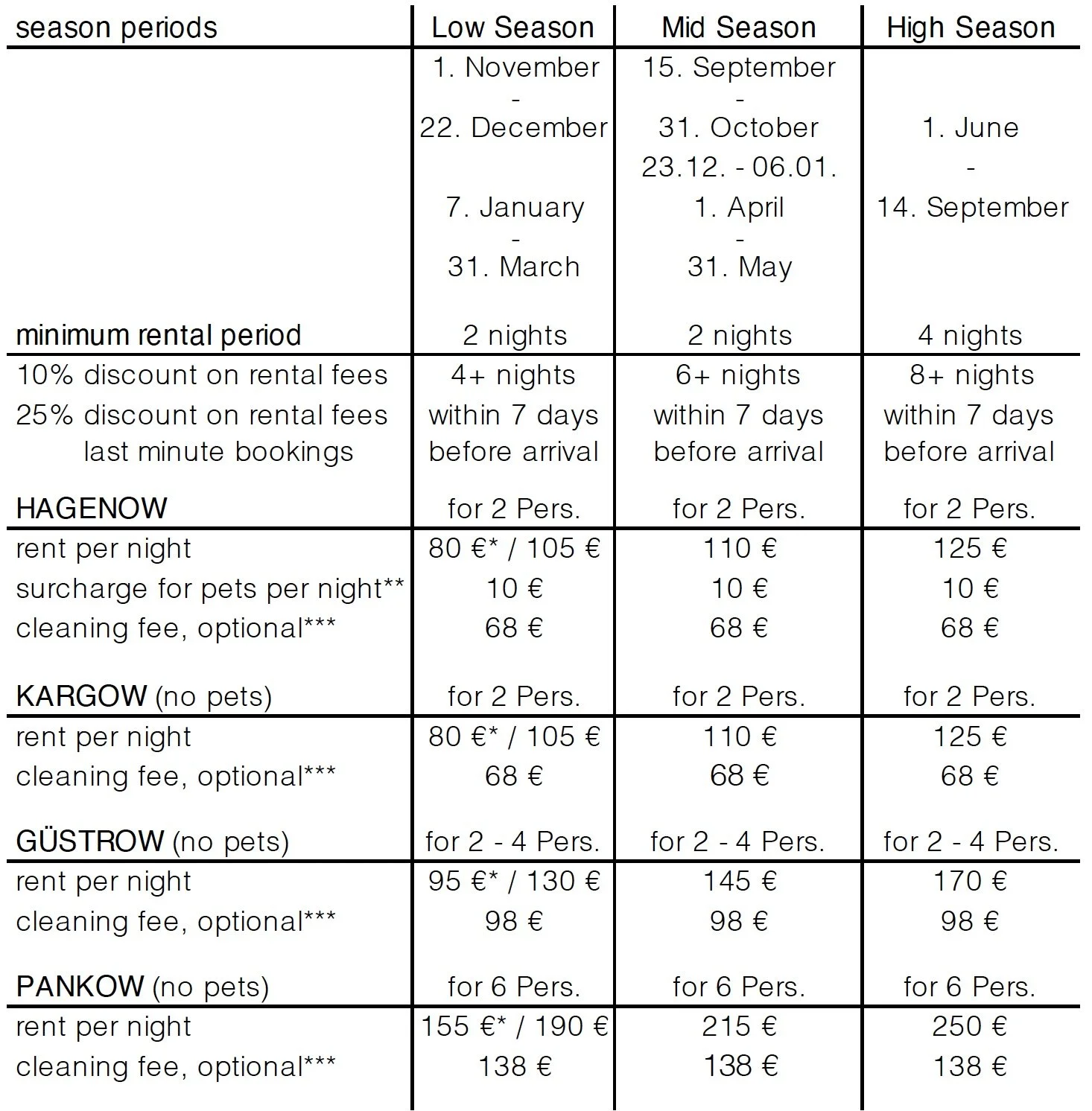 *** If you prefer to reduce the cleaning rate, kindly let us know. On your arrival, we will hand over an uncleaned apartment (of course we will have made sure that it is in an acceptable condition otherwise we will make sure it is) with stripped beds. Inside you will find fresh bed linens and towels as well as the required cleaning agents. This way, you can clean the apartment according to your personal preference. You will not have to clean the apartment on leaving. For this preparation service we will charge a service fee of € 10,-
