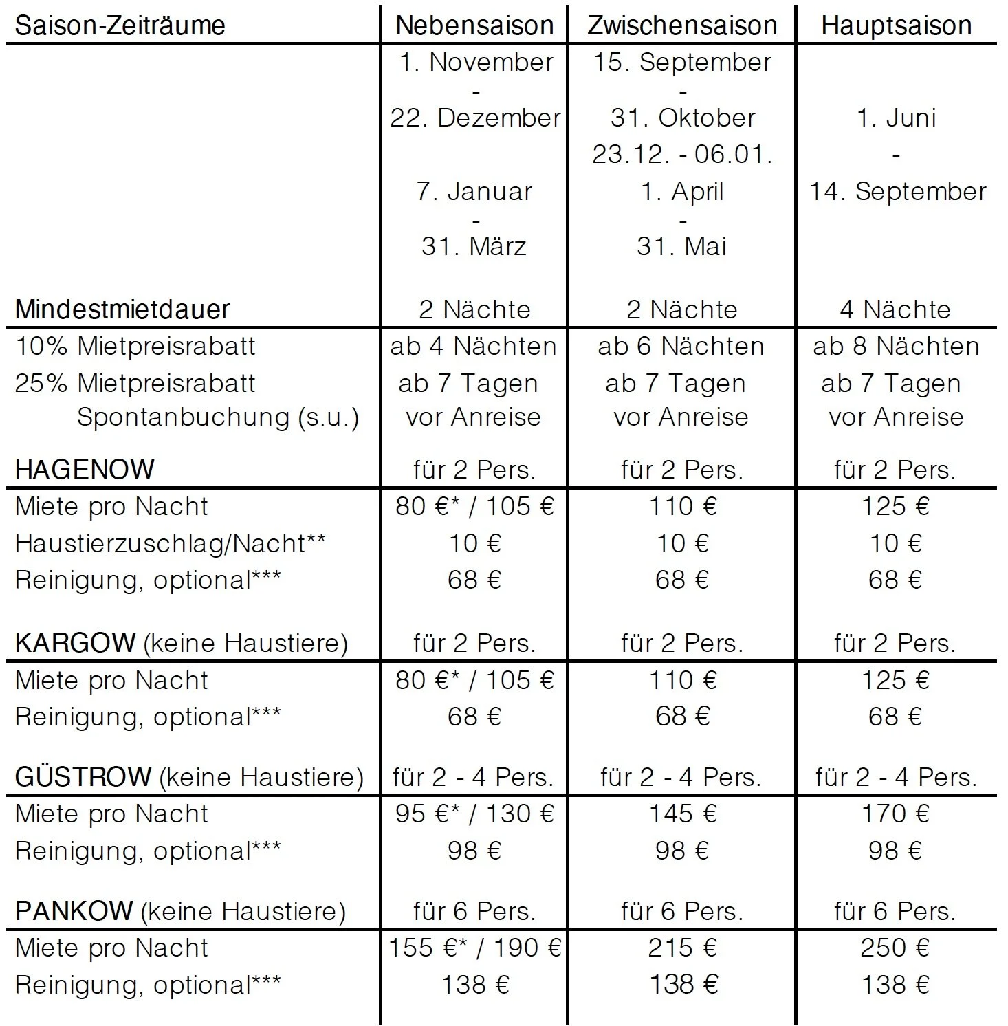 Die oben genannten Preise gelten pro Wohnung und Nacht. In diesen ist die aktuell gültige Mehrwertsteuer enthalten. Das Datum zu Beginn einer Übernachtung bestimmt die Saison und damit den Mietpreis für diese Nacht.